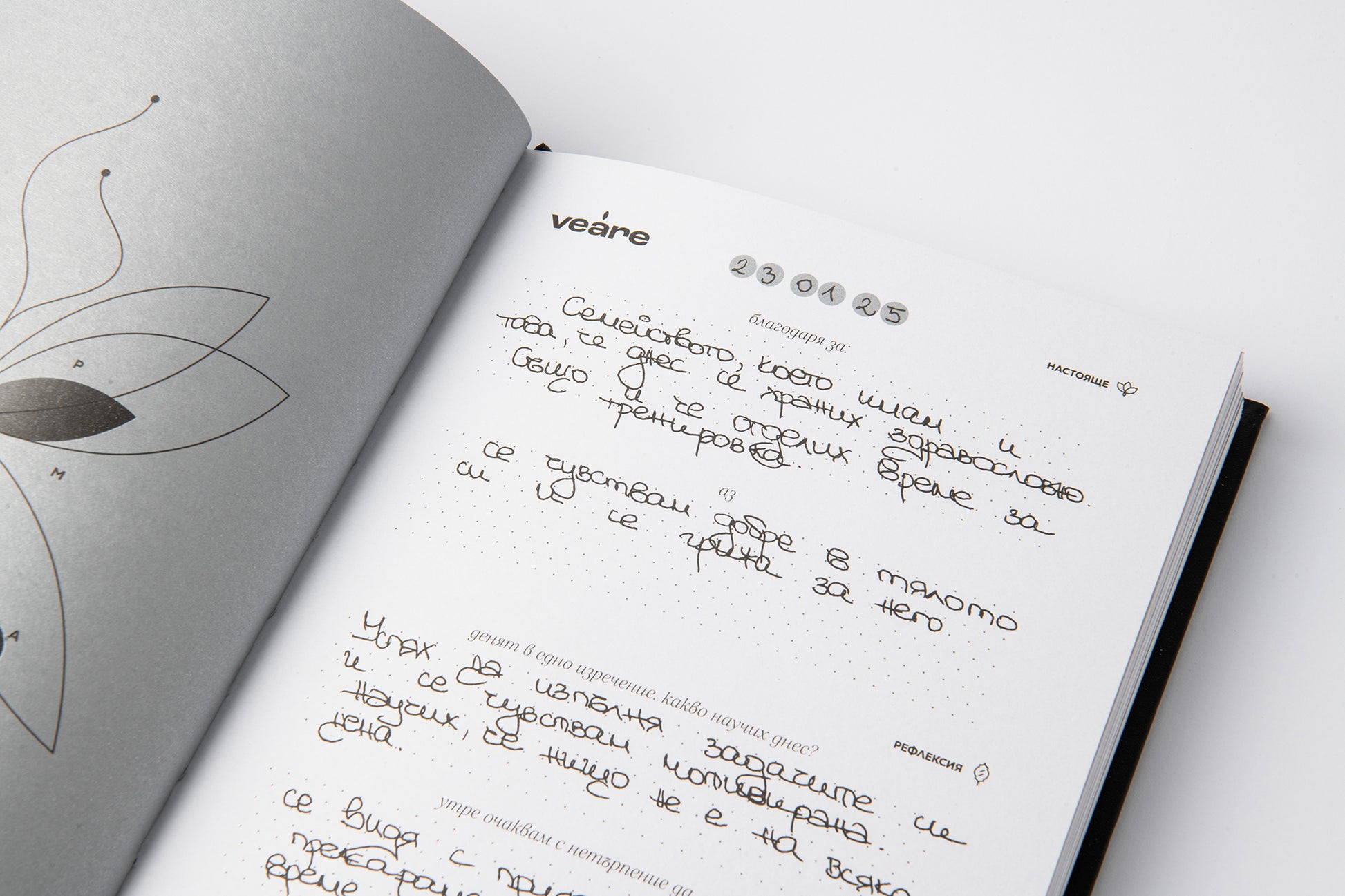 Дневни страници с 3 секции (настояще, рефлексия и бъдеще) и 5 въпроса фокусирани върху развитието ни